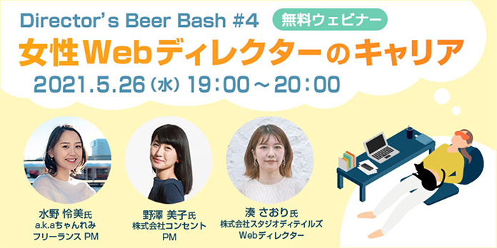 「Director’s Beer Bash」は、ウェブ業界のディレクターがキャリアについて語るシリーズセミナーです。第4回となる今回は「女性Webディレクターのキャリア」をテーマに、ウェブ制作のディレクターやプロジェクトマネージャーとして実務経験がある方を対象に開催されます。